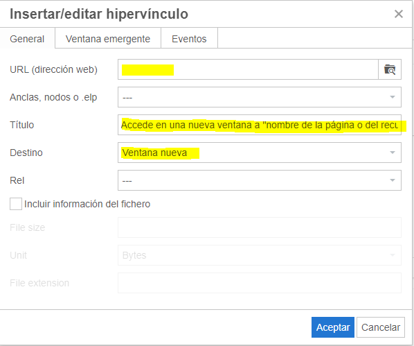 URL: La dirección de internet debe estar completa, llevar directamente al recurso y estar operativa.